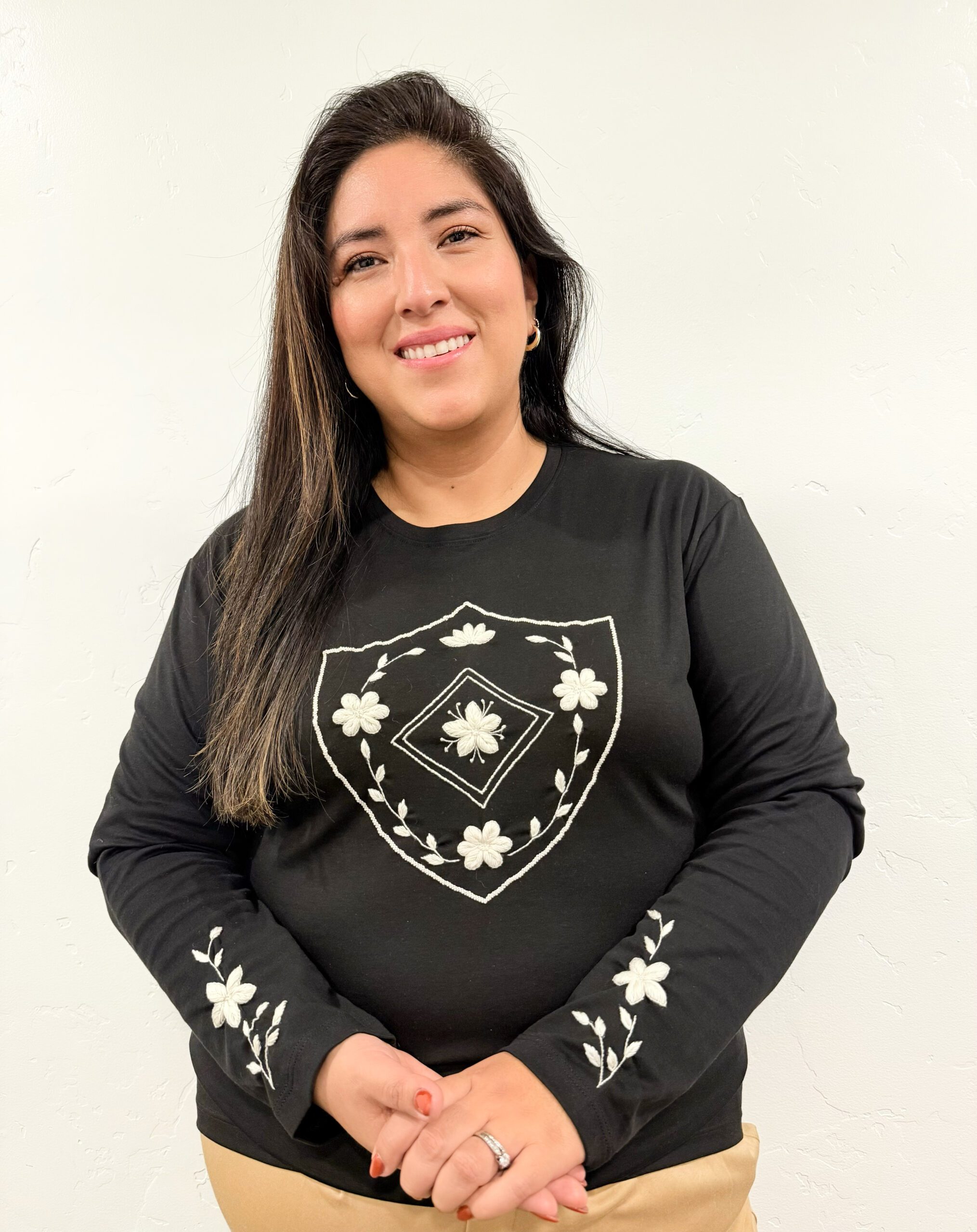 Each floral detail is hand-embroidered using natural cotton thread, symbolizing protection, rebirth, and self-love. Thoughtfully tailored in a classic silhouette, it offers comfort without compromising elegance — perfect for wearing on its own or layered under a blazer.